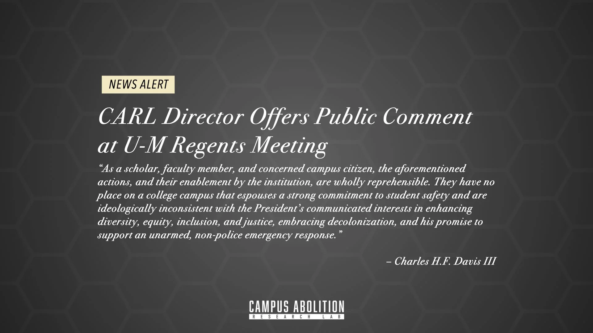 On December 7th, during the meeting of the University of Michigan Board of Regents, the University’s eight-member governing board, Dr. Charles H.F. Davis III offered public comment regarding campus racism and political repression of student activism by Palestinian, Arab and Muslim students and their supporters.
